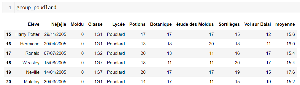 matieres=['Potions', 'Botanique','étude des Moldus', 'Sortilèges', 'Vol sur Balai'] poudlard['moyenne']=poudlard[matieres].mean(axis='columns') poudlard.head()