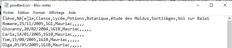Ouvrir le fichier poudlard.csv avec notepad++ ou un autre éditeur de texte et justifier l’appellation de l’extension .csv du fichier