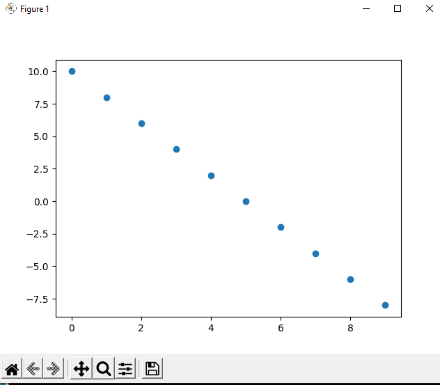import matplotlib.pyplot as plt x=[i for i in range(10)] y=[-2*xval+10 for xval in x] plt.scatter(x,y) plt.show()