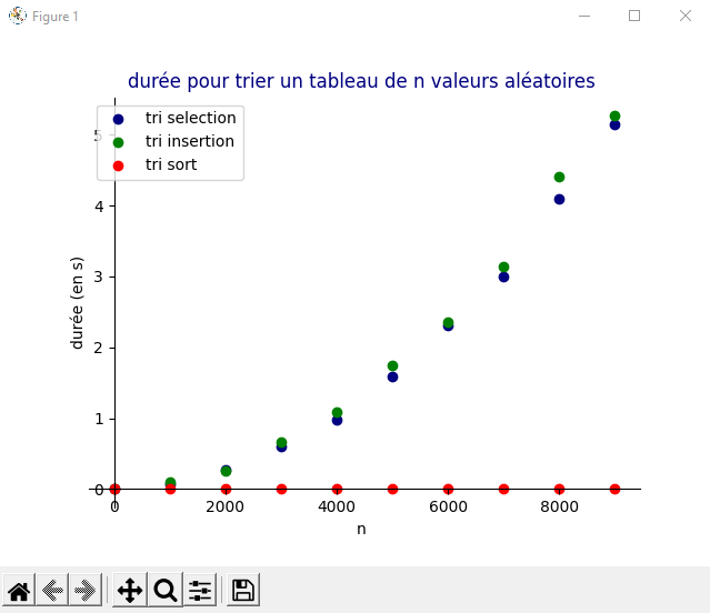 L’ordinateur viens de tester 3 techniques de tri et a calculé leur temps d’execution. On peut voir que le tri sélection, code que nous avons codé et celui d’insertion ont beaucoup plus de temps d’execution que le tri sort qui est fait par python. Plus, il n’augmente pas celon la grandeur des tableaux. Pour les grandes entreprises la methode sort est bien meilleure.