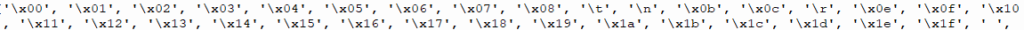 Ainsi on peut créer une liste pour développer le code et les caractères présents dans ce dernier à savoir 128 caractères seront dévoilé. Seul les caractères spéciaux seront présentés sous forme hexadécimal.