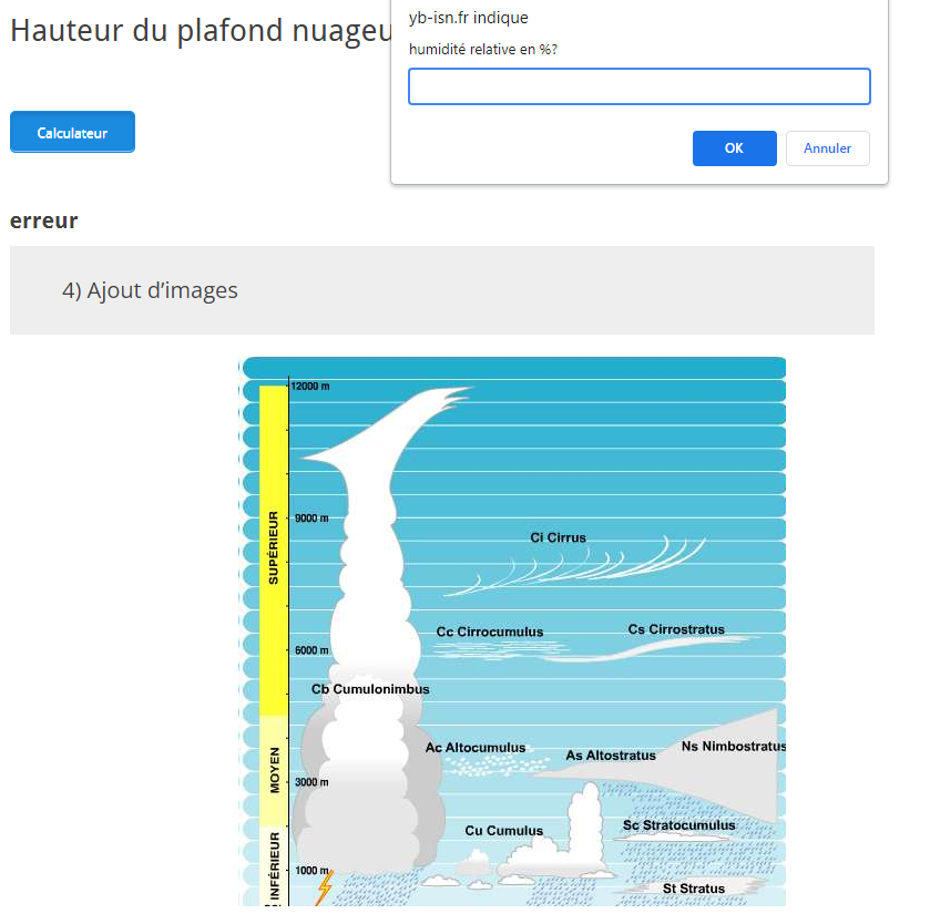 Enoncé : calculer et afficher la hauteur du plafond nuageux à partir de la température et du taux d’humidité dans une page web.