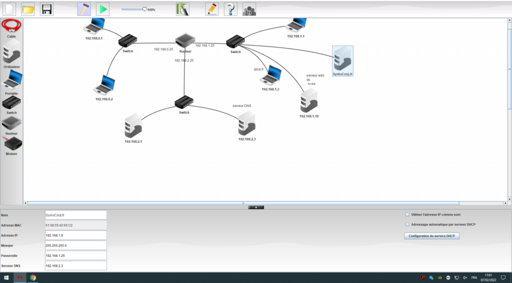 En suite on va configurer notre SERVEUR DNS avec notre nom de domaine ici « SyskoCorp.fr » et son IP ici 192.168.1.9