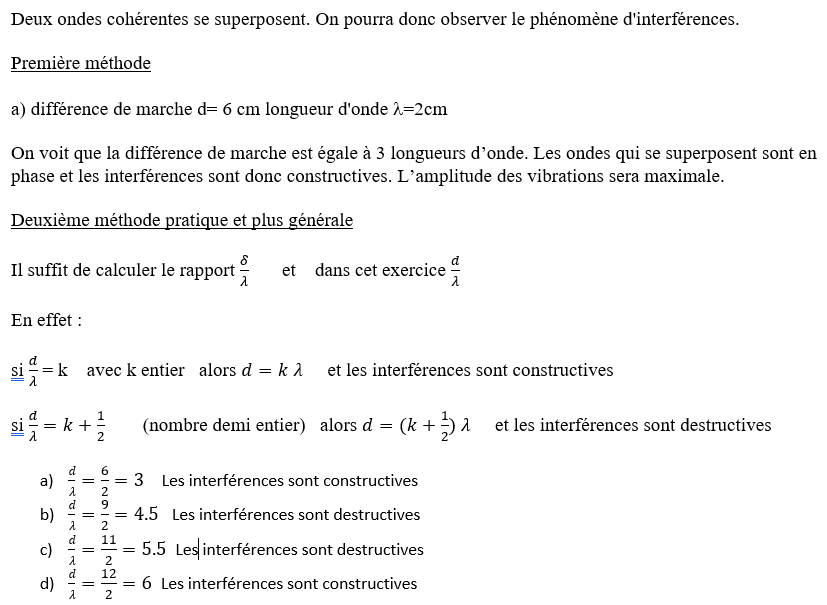EXERCICE : Deux ondes cohérentes de longueur d’onde 2cm se propagent à la surface de l’eau.Elles arrivent en un même point avec une différence de marche d.