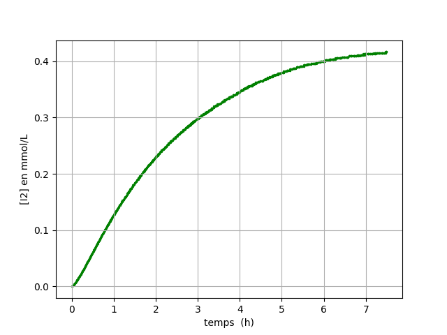 Le milieu réactionnel est constitué d’un mélange de deux solutions aqueuses.5mL de peroxodisulfate à 0.025mol/L et 25mL d’ions iodure à 0.005 mol/L. On effectue un suivi cinétique à 450nm ave une mesure d’absorbance toutes les deux minutes pendant huit heures.